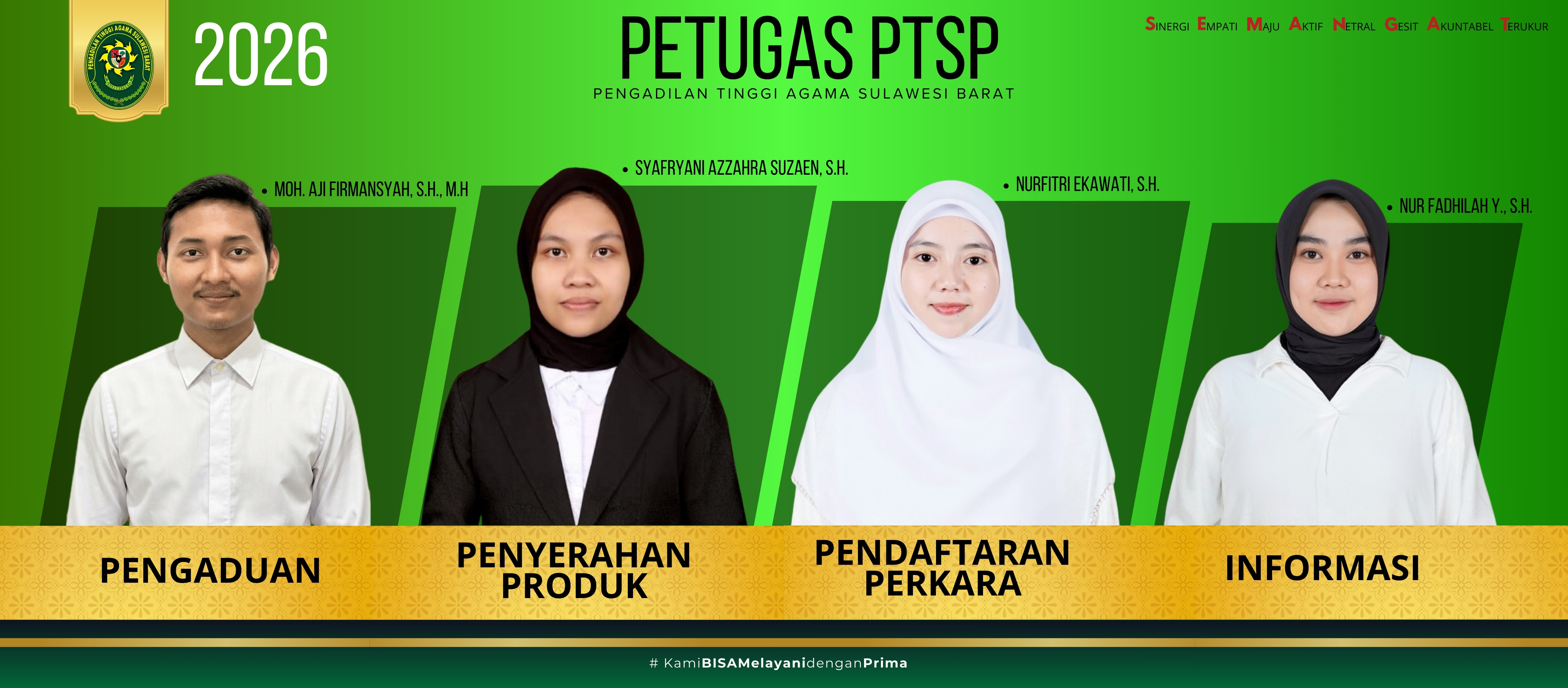 Pelayanan Terpadu Satu Pintu (PTSP) Ditulis oleh Taufik Hidayat on 14 Maret 2026. Petugas PTSP/Informasi & Pengaduan NO. NAMA DOKUMENT 1 SK Tim Pengelola Pelayanan PTSP BUKA 2 SK Tim Penanganan Pengaduan BUKA 3 SK Petugas Pengelola Meja Informasi BUKA
