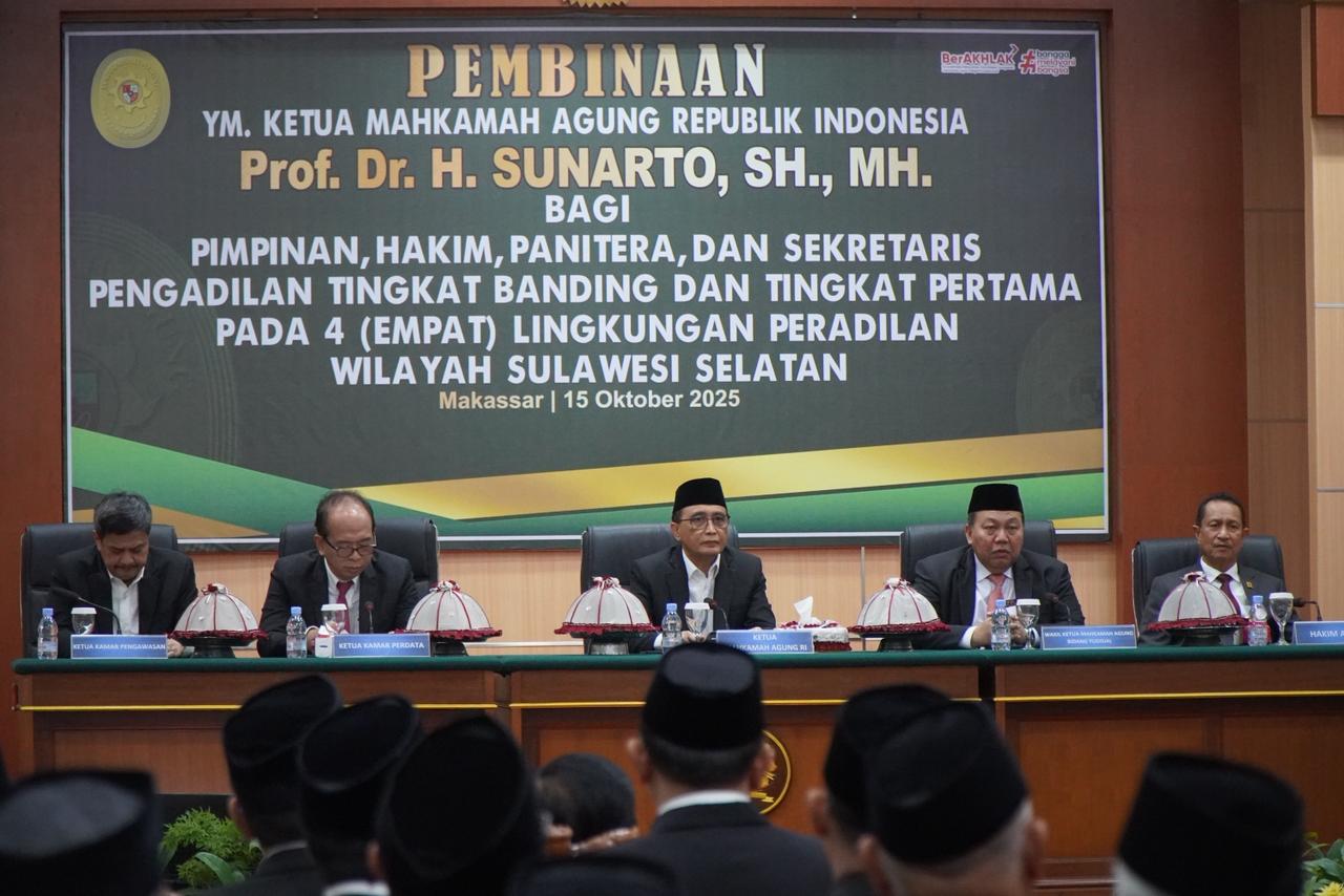 Puncak acara menjadi lebih istimewa dengan kehadiran Ketua Mahkamah Agung Republik Indonesia, YM Prof. Dr. Sunarto, S.H., M.H. Setelah prosesi wisuda purnabakti selesai dilaksanakan, Ketua Mahkamah Agung memberikan pembinaan secara langsung kepada seluruh jajaran hakim dan aparatur peradilan yang hadir.